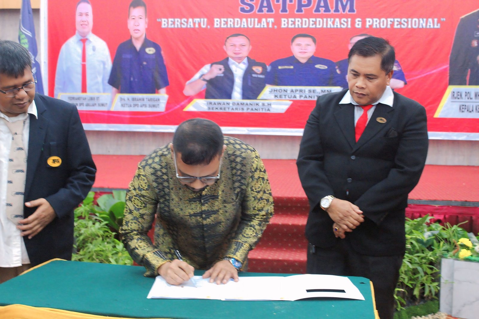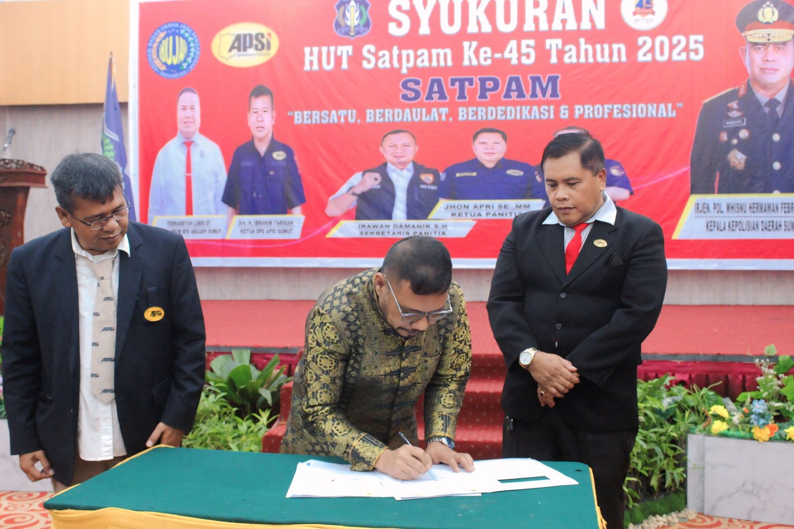 Penandatanganan MOU dilaksanakan pada acara HUT Satpam ke 45 yang mengangkat tema Satpam bersatu, berdaulat, berdedikasi dan profesional di Hotel Madani Medan, Kamis (8/1/2026).