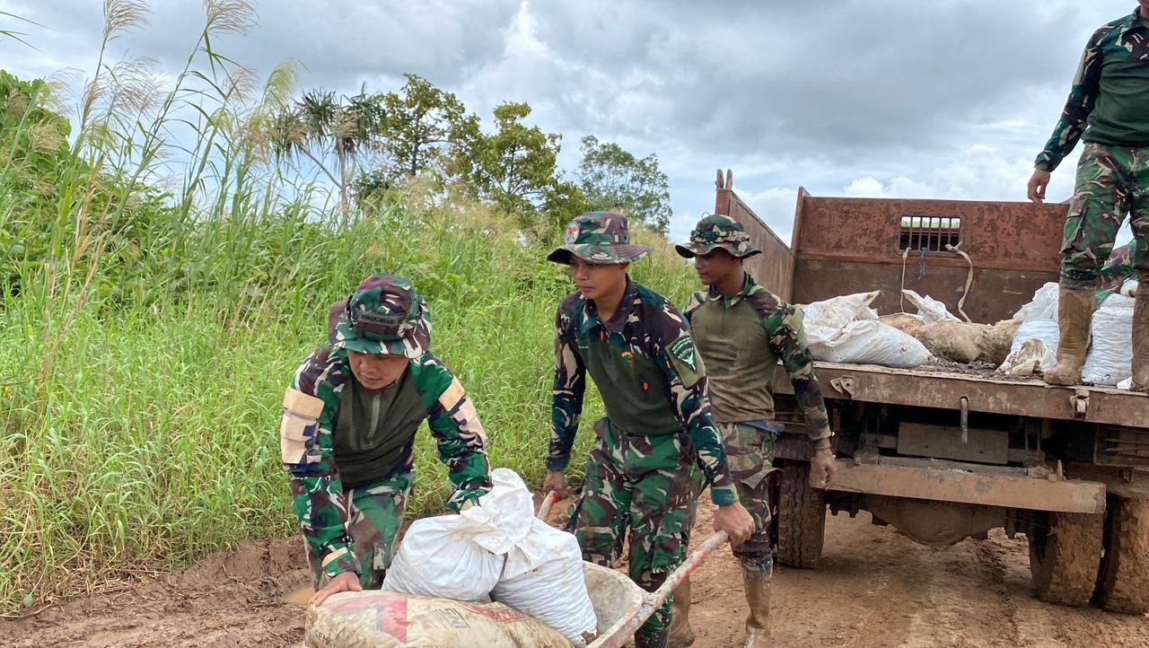 Melihat kondisi tersebut, personel Satgas Yonif 123/RJW berinisiatif melakukan perbaikan sementara melalui gotong royong bersama warga. Upaya ini dilakukan sebagai bentuk kepedulian terhadap kelancaran aktivitas masyarakat sekaligus untuk mengurangi hambatan distribusi logistik yang selama ini terganggu.