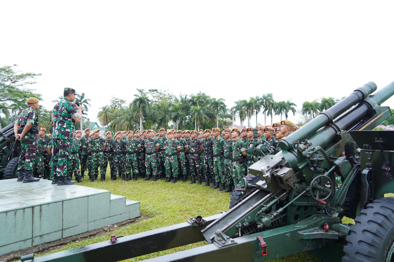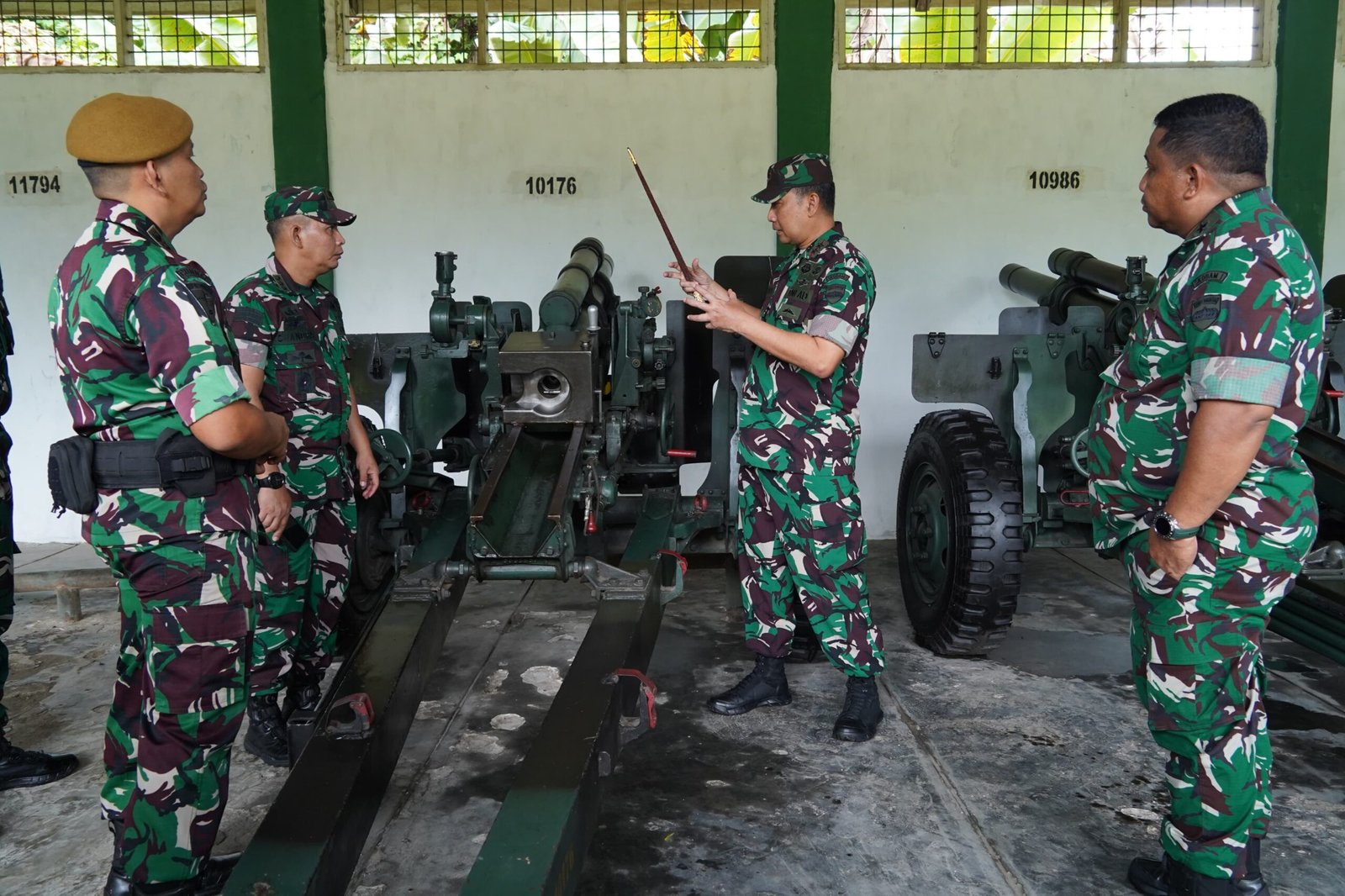 Setelah pengarahan, Pangdam melaksanakan pengecekan garasi kendaraan, gudang meriam, serta gudang munisi meriam guna memastikan kesiapan operasional satuan, khususnya terkait kondisi alutsista dan sarana pendukung.
