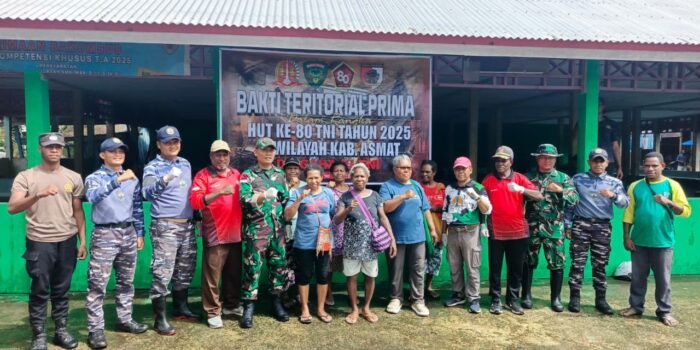 Agats – Dalam rangka menyambut HUT TNI ke-80, Pos Komando Utama Satgas Yonif 123/Rajawali bersama Koramil 1707-08/Agats melaksanakan kegiatan Bakti Teritorial Prima di Pasar Mama Muyu, Kota Agats, Rabu (17/9/2025).
