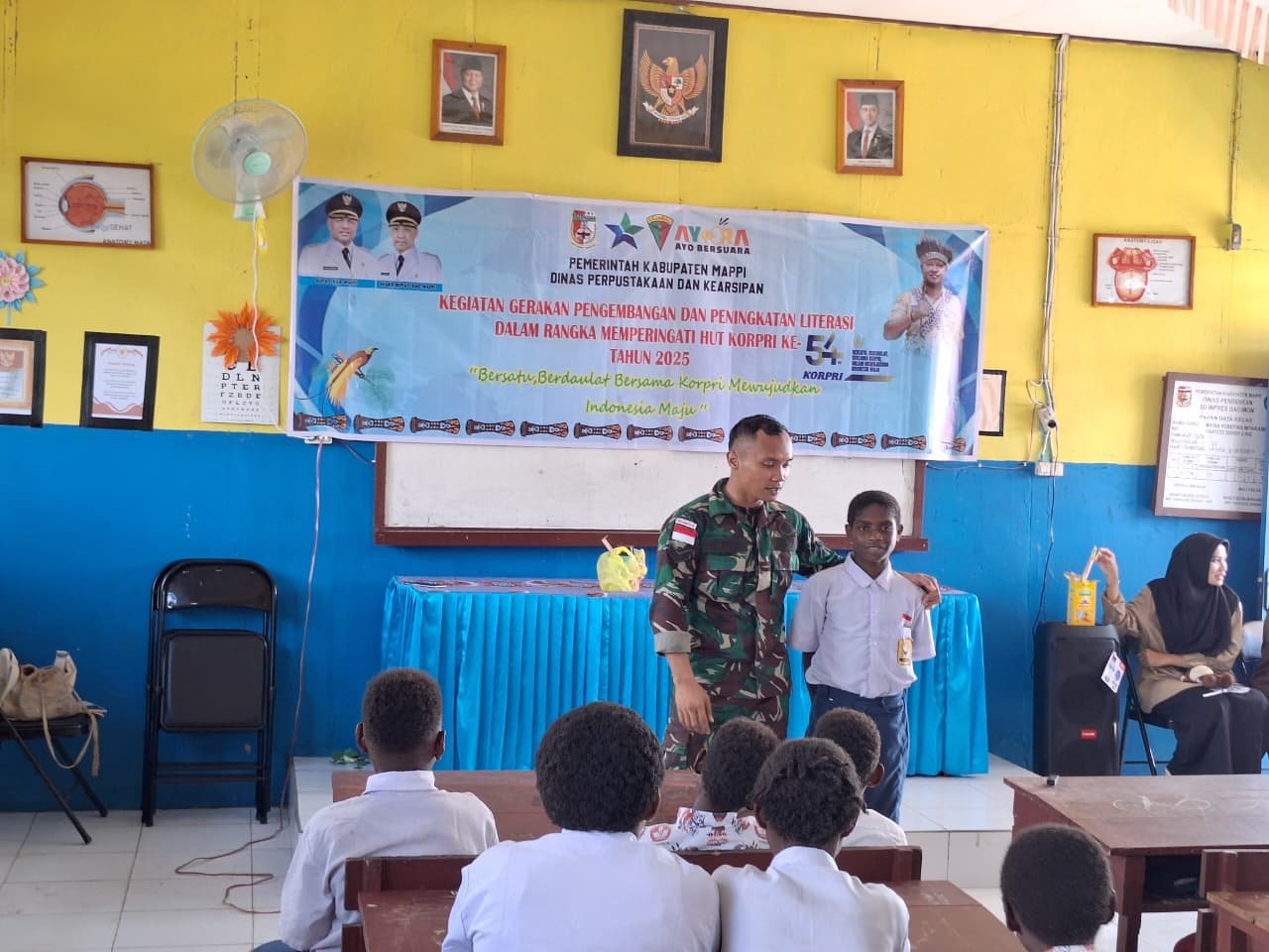 Mappi – Satuan Tugas (Satgas) Batalyon Infanteri (Yonif) 123/Rajawali Pos Kotis bekerja sama dengan Dinas Perpustakaan menggelar kegiatan gerakan pengembangan dan peningkatan literasi di SD Inpres Dagimon, Kampung Dagimon, Distrik Obaa, Kabupaten Mappi, Papua Selatan. Kegiatan ini bertujuan untuk meningkatkan minat baca dan kemampuan literasi siswa-siswi di wilayah tersebut. Selasa,(02/12/2025)