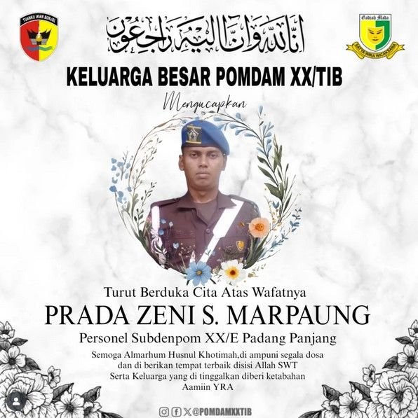 Kapendam XX/Tuanku Imam Bonjol Letkol Kav Taufiq, S.Sos., M.M., mewakili Panglima dan keluaga besar Kodam XX/Tuanku Imam Bonjol menyampaikan “Duka yg mendalam tidak hanya dirasakan oleh warga sumbar, tapi juga Kodam XX/Tuanku Imam Bonjol dimana terjadi musibah yang menimpa beberapa Prajurit yang sedang bertugas di lapangan untuk membantu pengaturan lalunlintas dan evakuasi warga. Panglima dan keluaga besar Kodam XX/Tuanku Imam Bonjol juga memberikan penghormatan setinggi-tingginya atas pengabdian dan dedikasi kepada Prada Zeni Marpaung yang tewas dalam menjalankan tugas”. Ujar Kapendam